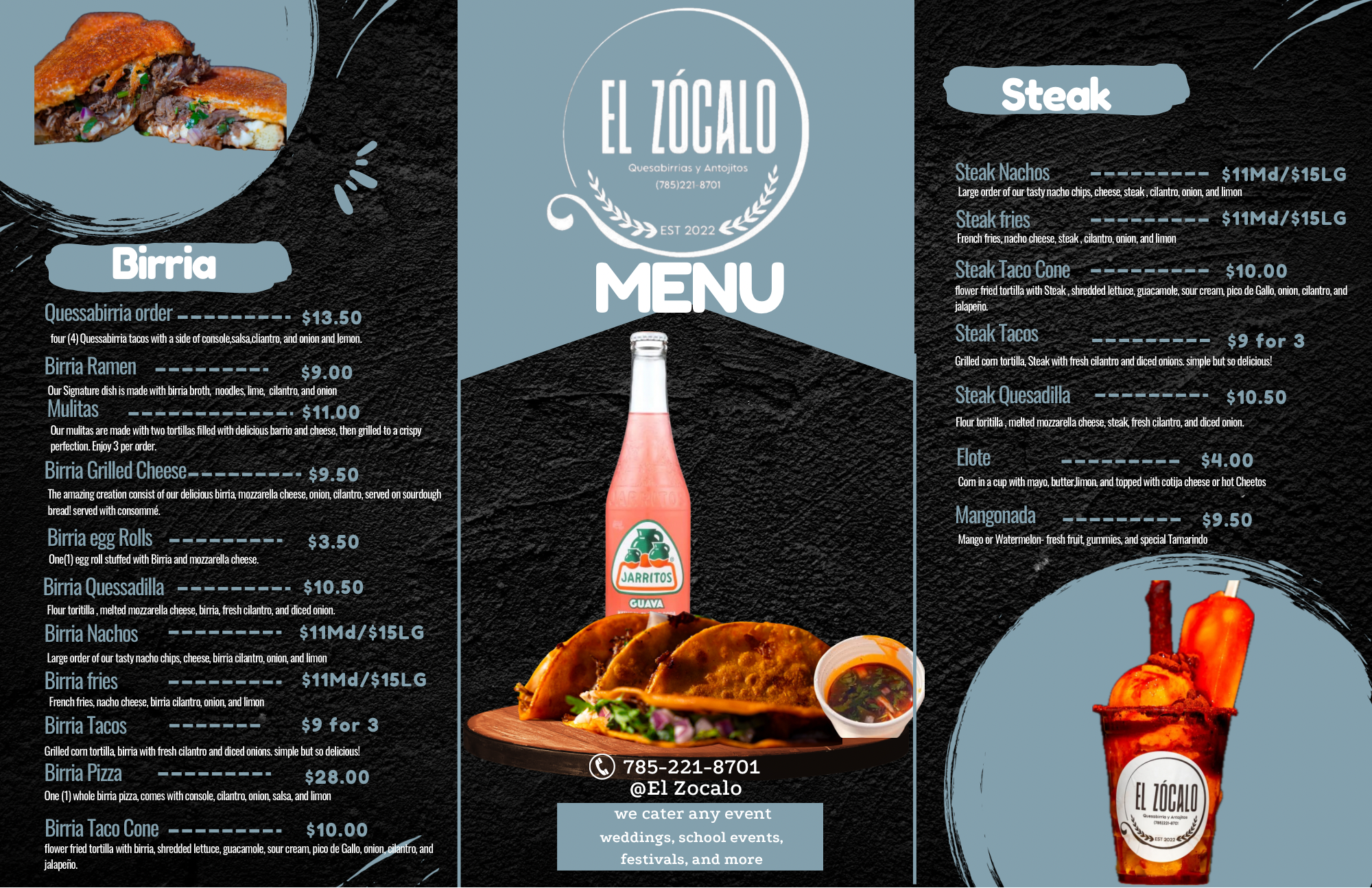 At El Zócalo, we believe the best tacos start with passion — and you can taste it in every bite. Our birria is slow-cooked to perfection, packed with authentic Mexican spices, and simmered until it’s melt-in-your-mouth tender. Then we load it into crispy, golden tacos layered with melted cheese and a side of rich, flavorful consommé for dipping. Every taco we serve is made fresh, crafted with love, and inspired by generations of family recipes — but with a modern twist that’s uniquely ours. Whether it’s your first time trying birria or you’re already hooked, one bite and you’ll know why our customers say we have the best tacos ever!